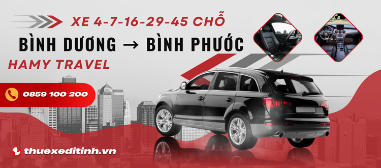 Bạn đang tìm dịch vụ thuê xe từ Bình Dương đi Bình Phước an toàn, nhanh chóng, giá rẻ? Hamy Travel – đơn vị hàng đầu trong lĩnh vực vận chuyển hành khách, chuyên cung cấp dịch vụ thuê xe 4, 7, 16, 29, 45 chỗ từ Bình Dương đến Bình Phước và ngược lại. Chúng tôi hỗ trợ đưa đón tận nơi tại các địa điểm ở Bình Dương như Thủ Dầu Một, Dĩ An, Thuận An… đến các huyện, thành phố lớn tại Bình Phước như Đồng Xoài, Bù Đăng, Chơn Thành… Liên hệ ngay 0859100200 để đặt xe nhanh chóng – hỗ trợ 24/7!